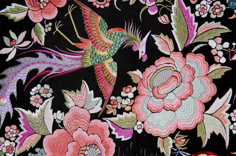 本次展览从外销广绣的代表“马尼拉披肩”说起,探究关系如何巧用广府意蕴的针线语言,诠释多元文化内涵。内容分为广绣越洋之路、马尼拉披肩传奇、绣焕新姿在顺德三部分,展出多幅外销广绣大披肩,展品时间跨度由1850年至2008年。广绣大披肩构图之巧妙、绣工至精细让人惊叹。
