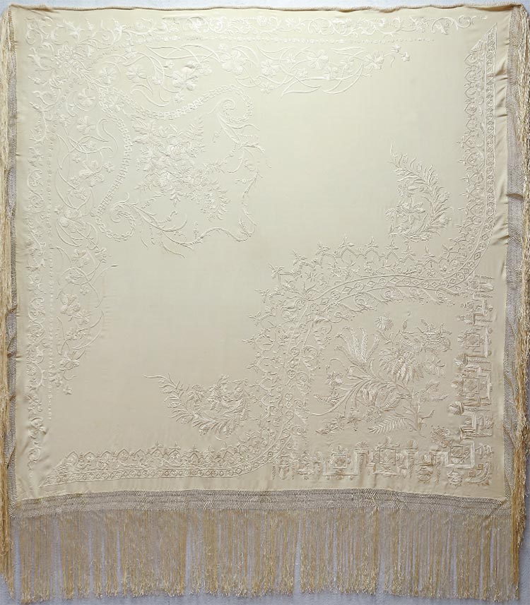 婚礼披巾往往使用一次之后就珍藏起来,所以磨损、脱线、污染的机会少一些。这件披巾已有120-180年了,品相还非常好。