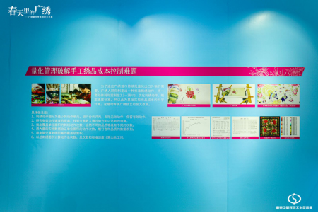 第三部分“长盛不衰话披巾”分为两个主题,呈现广绣生产的产业化发展路径,特别是广绣人推进现代化管理的进程。郑乃谦表示:“很多人没想到一张披巾,我们可以准确地计算出上面的线有多少米,要做成这条披巾用多少万的针布来做出来,这些都是用科学计算成本,我们做到了,误差只有3%!”展览中还展出了绣工动作分析表、速度记录表,绣品色彩分析图谱等,让人一睹当代企业架构下传统手工艺在生产效率、产品品控等方面的进步。